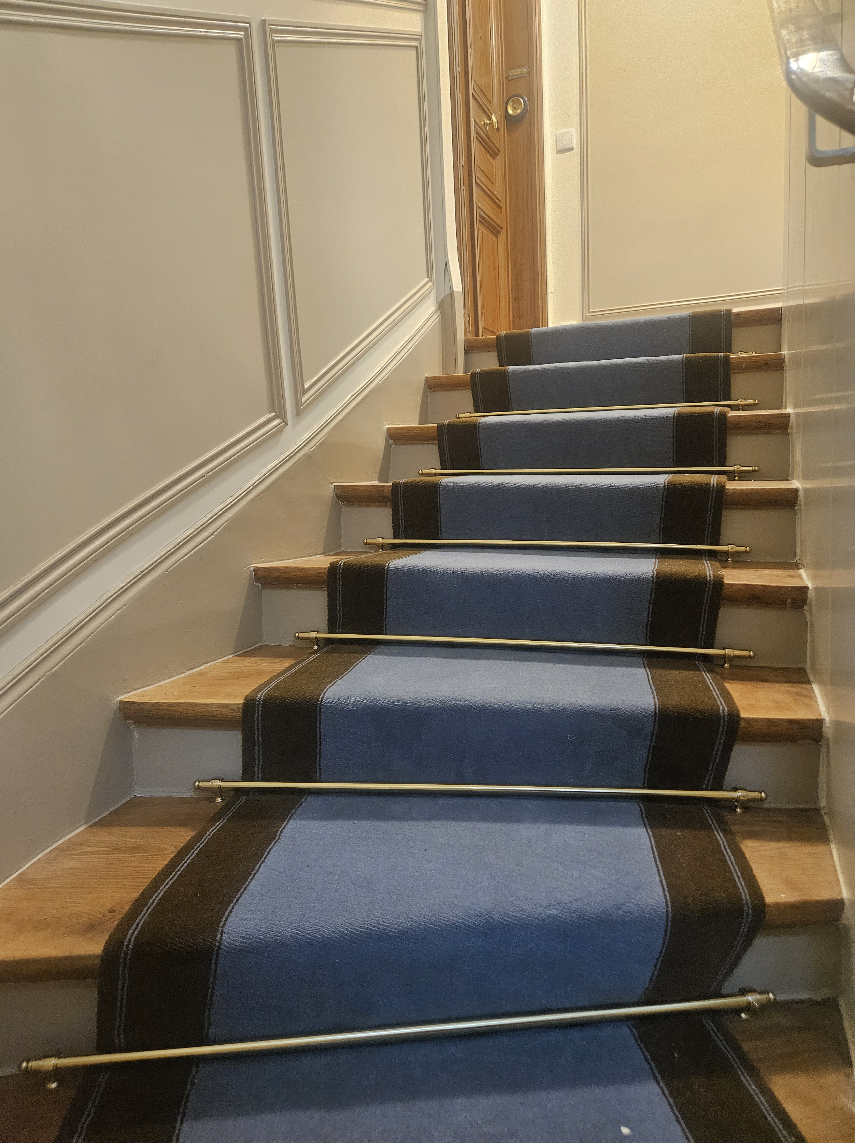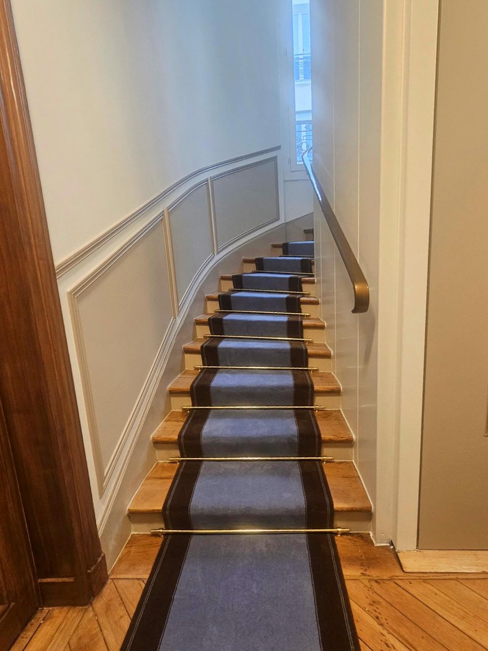Rénover un immeuble ne signifie pas forcément le moderniser, mais parfois lui redonner son caractère et son âme. C’est dans cet esprit que nous avons mené la rénovation des parties communes de cet immeuble haussmannien, en veillant à préserver son authenticité tout en améliorant le confort et la qualité. Nous avons ainsi entrepris de restituer l’élégance d’origine grâce à la restauration des parquets, la peinture effet bois sur les portes, la reprise complète de l’éclairage, l’ajout de moulures, la réfection de l’ensemble des peintures et la mise en place d’une moquette d’escalier qui valorise la cage tout en offrant confort et sécurité. Chaque détail a été pensé pour conjuguer respect du patrimoine, mise en valeur esthétique et qualité d’usage au quotidien.